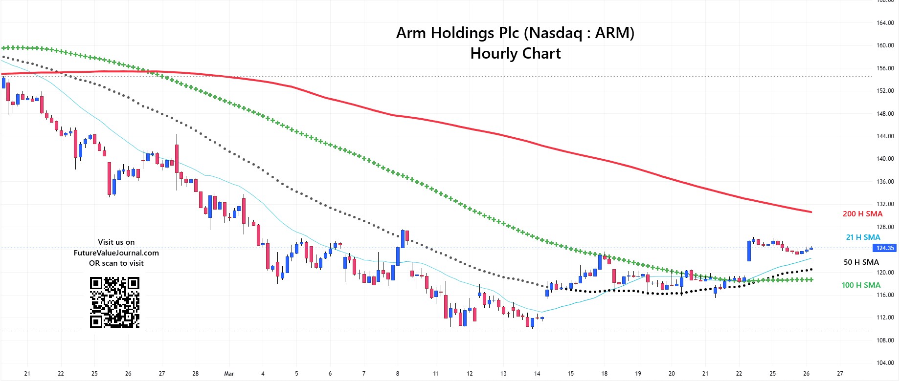 ![]() View Hourly Chart (Every candle represents Nasdaq : ARM share’s trading session of one hour. Each single candle represent the HIGH, LOW, OPEN, CLOSE of that particular hour) | On hourly time-frame, we can observe that ARM stock is trading ABOVE the 21 hour, 50 hour & 100 hour SMA BUT BELOW 200 hour SMA. This indicates that the ARM stock is in Sideways to UP trend for short term. |