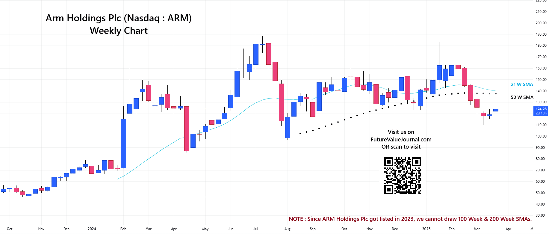 ![]() View Weekly Chart (Every candle represents Nasdaq : ARM stock’s trading session of one week. Each single candle represent the HIGH, LOW, OPEN, CLOSE of that particular week) | On the weekly time-frame ARM stock is trading BELOW 21 weeks & 50 weeks SMA. This indicates that ARM stock has a clear Bearish sentiment. |
