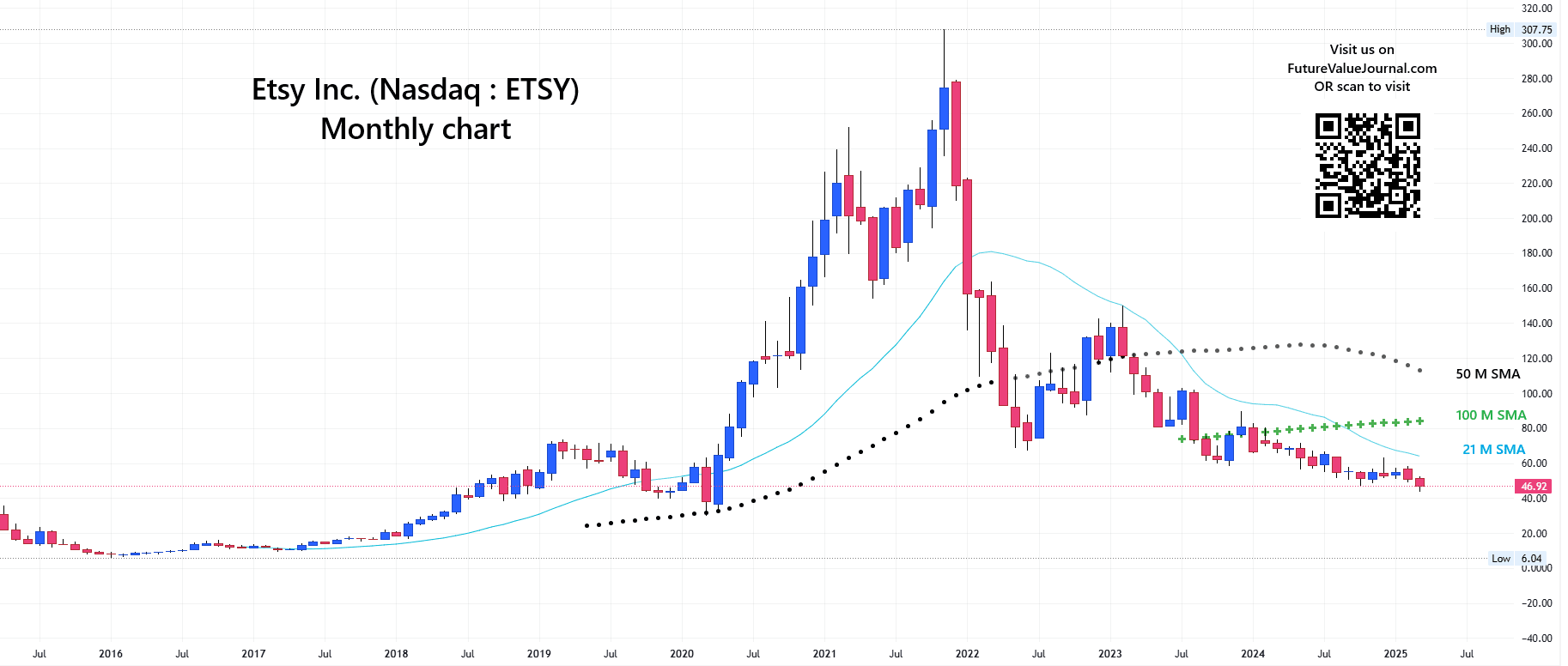 ![]() View Monthly Chart (Every candle represents Nasdaq : ETSY stock’s trading session of one Monthly. Each single candle represent the HIGH, LOW, OPEN, CLOSE of that particular Monthly) | On Monthly time-frame, we can observe that ETSY stock is trading BELOW 21 Month, 50 Month & 100 Month SMA. This indicates that the ETSY stock is in Sideways to Downtrend for Very Long term. You can notice the support zone between $40 – 60. |